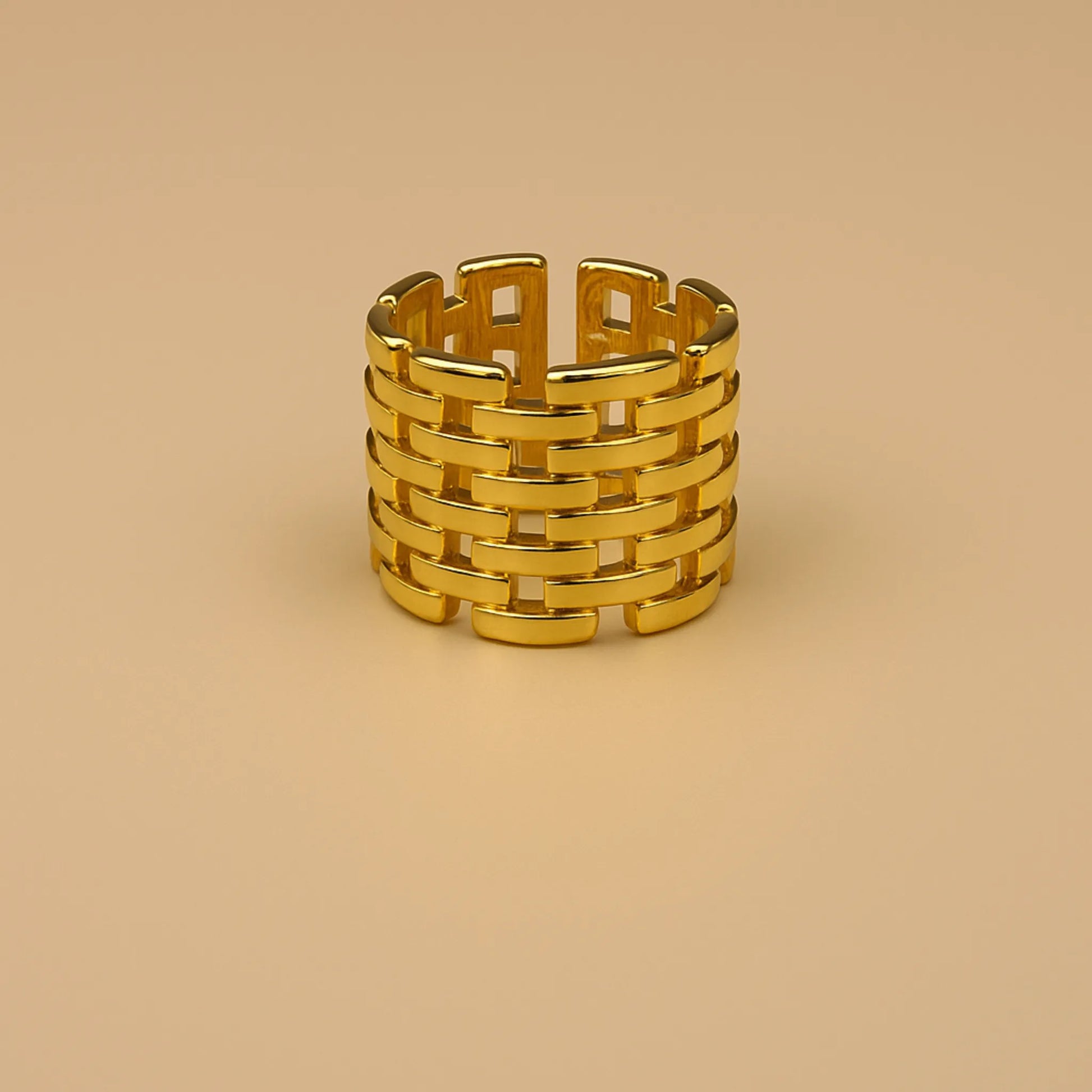 Anillo Ancho Tejido Dorado, un diseño llamativo con acabado entrelazado tipo malla, ideal para lucir una propuesta moderna y con carácter.