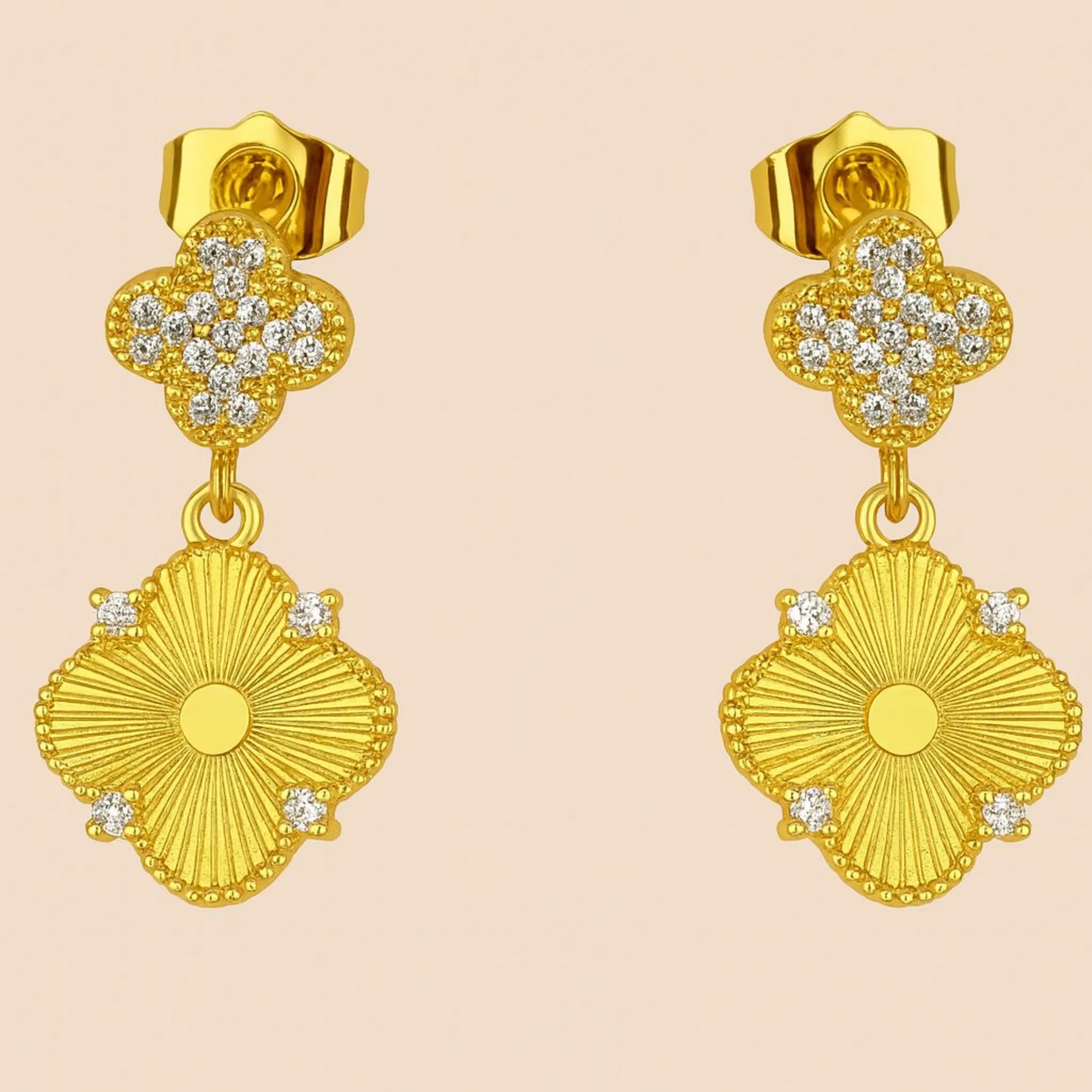 Aros dorados con diseño doble de flor, una superior con circones y otra inferior en acabado texturizado con brillo. Ligeros, llamativos y fáciles de combinar.