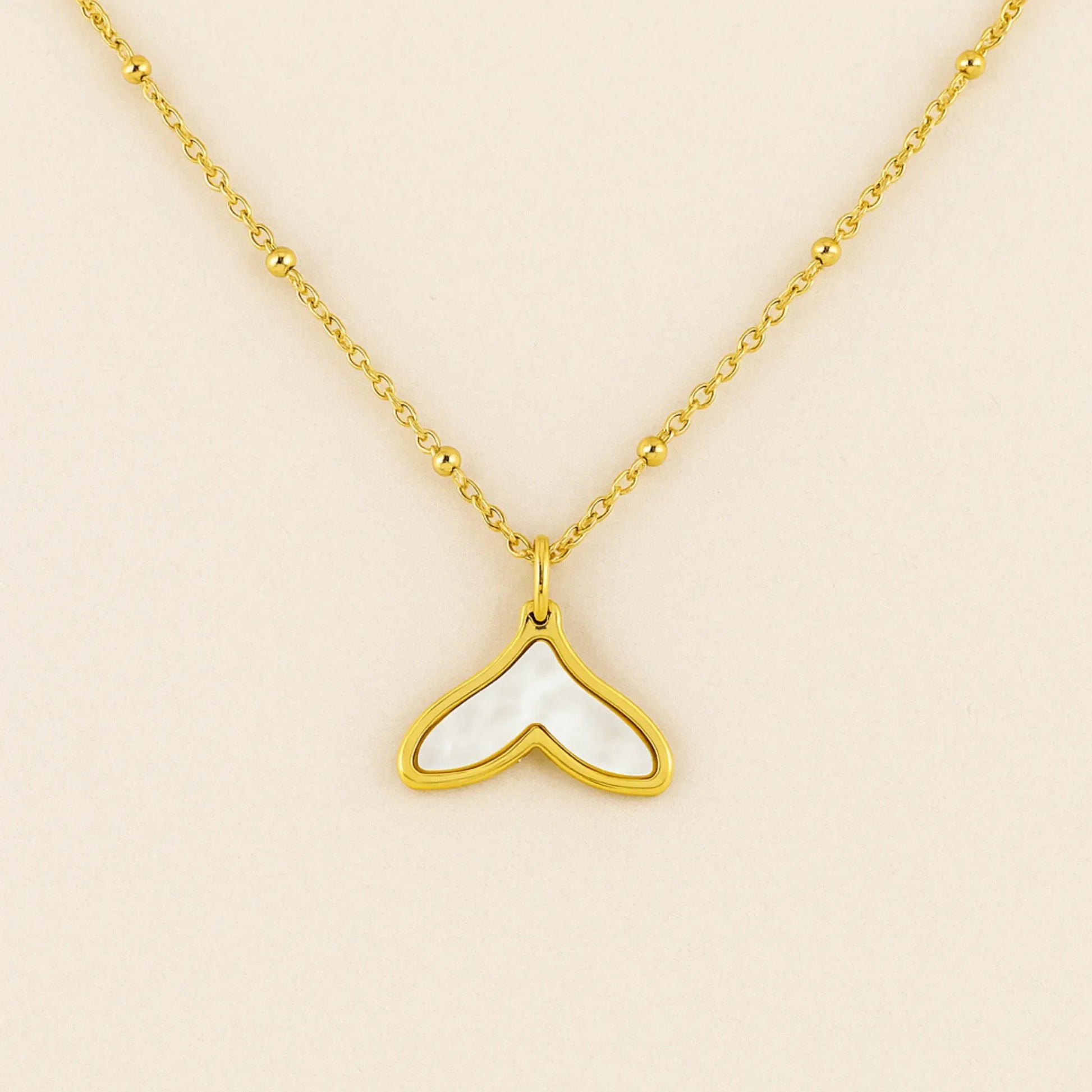 Collar Cola de Ballena Nacarada, un diseño elegante inspirado en el mar, con dije en forma de cola de ballena relleno de nácar blanco y borde dorado. Perfecto para complementar cualquier look con un toque delicado y natural.