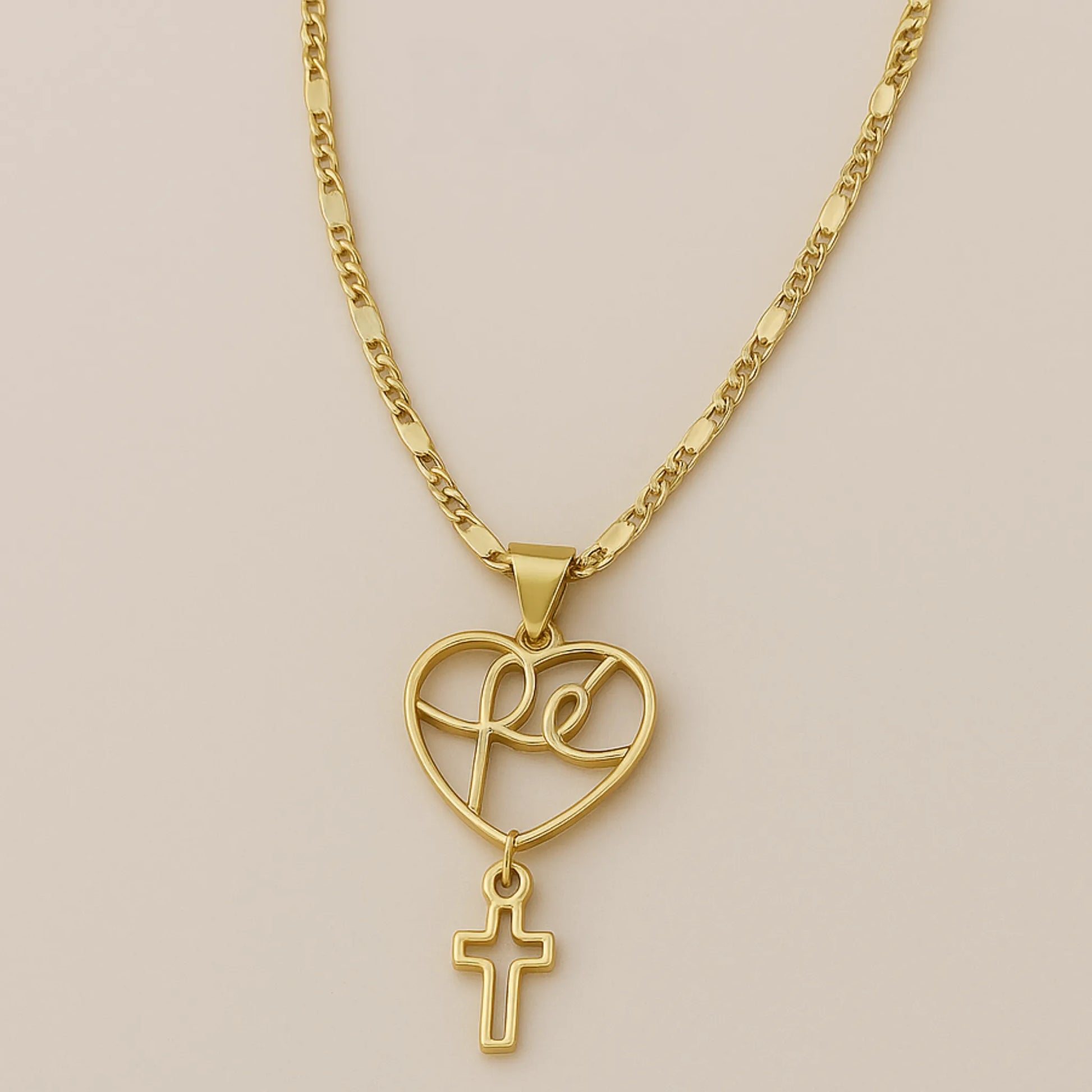 Collar Corazón Fe con Cruz, un diseño delicado y elegante que combina espiritualidad y estilo en una pieza única. Su dije en forma de corazón con la palabra "Fe" y una cruz colgante lo convierten en un accesorio especial y versátil.