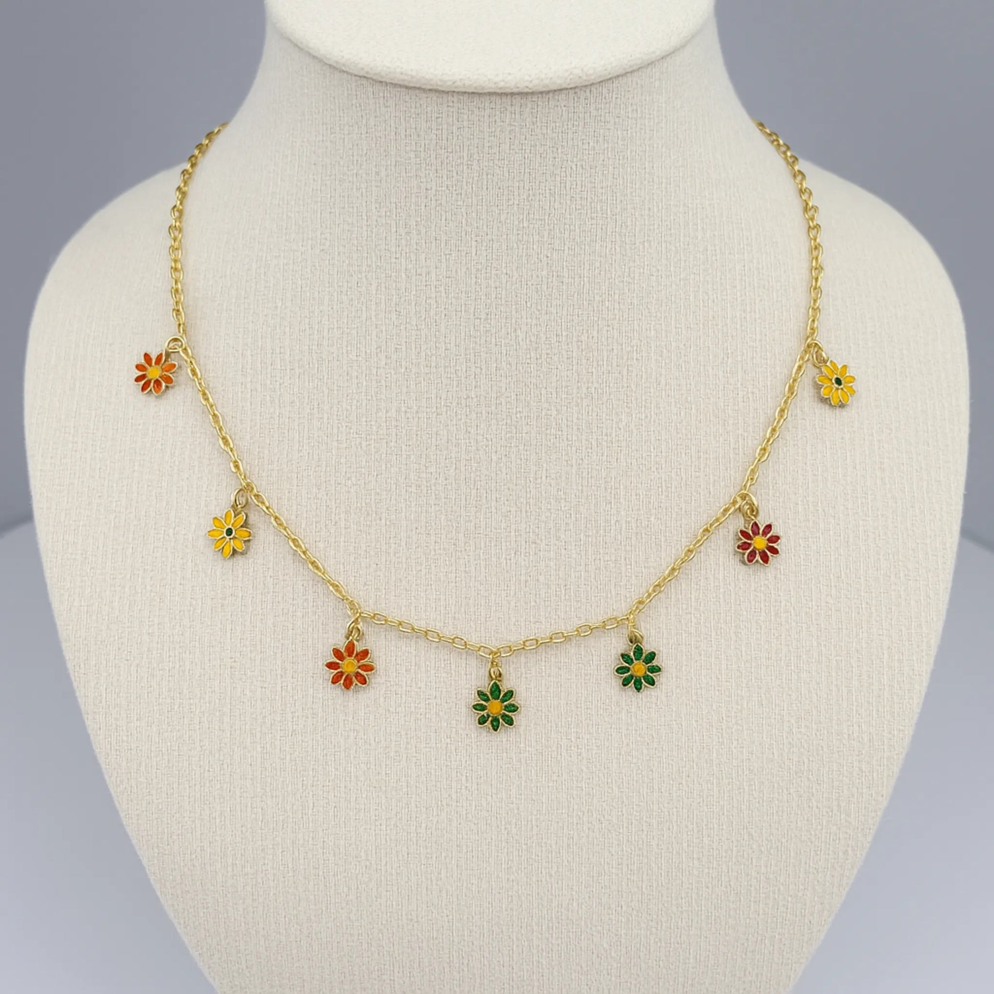 Collar Margarita Multicolor, un diseño encantador compuesto por dijes de margaritas en esmalte de colores vivos, colgando delicadamente de una cadena dorada. Ideal para sumar alegría y estilo.